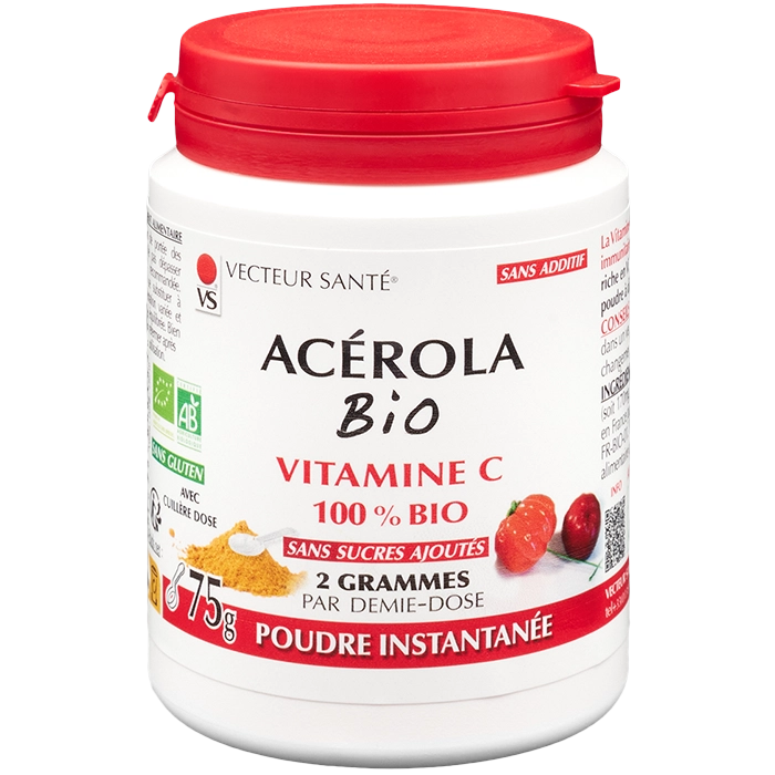 Acérola Bio en poudre (jus d’acérola déshydraté à basse température), titrée à 17% de vitamine C d’origine naturelle. La vitamine C contribue au fonctionnement normal du système immunitaire, aide à réduire la fatigue et à la formation normale de collagène. Sans additif ni sucre ajouté. Fabriqué en France. Pot 75 g. Cuillère doseuse graduée incluse.