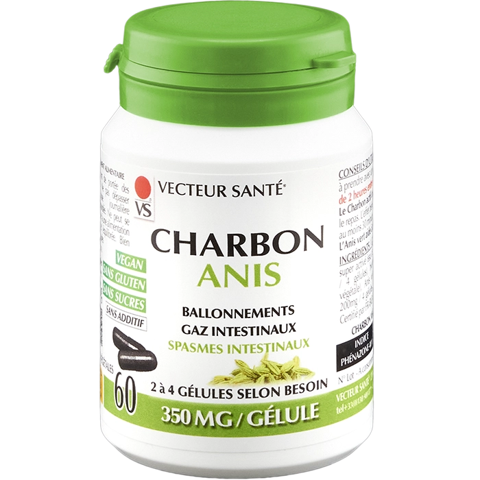 Charbon Anis associe du charbon végétal super activé et de l’anis vert bio. Le charbon actif, très poreux, peut adsorber certaines substances présentes dans le tube digestif. Il contribue à réduire l’excès de flatulence après le repas; l’effet bénéfique est obtenu avec 1 g au moins 30 minutes avant le repas et 1 g juste après. Fabriqué en France. Pilulier de 60 gélules.