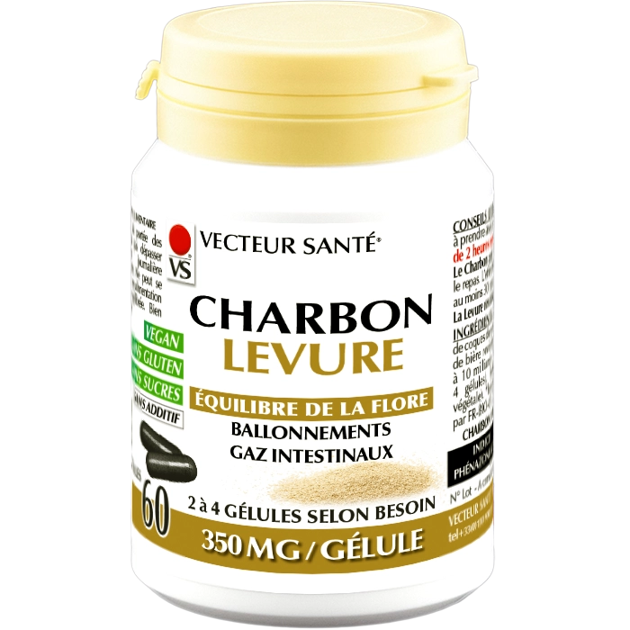 Charbon Levure associe du charbon actif et de la levure de bière revivifiable bio. Le charbon actif contribue à réduire l’excès de flatulence après le repas, à raison d’au moins 1 g 30 minutes avant le repas et 1 g juste après. Fabriqué en France.