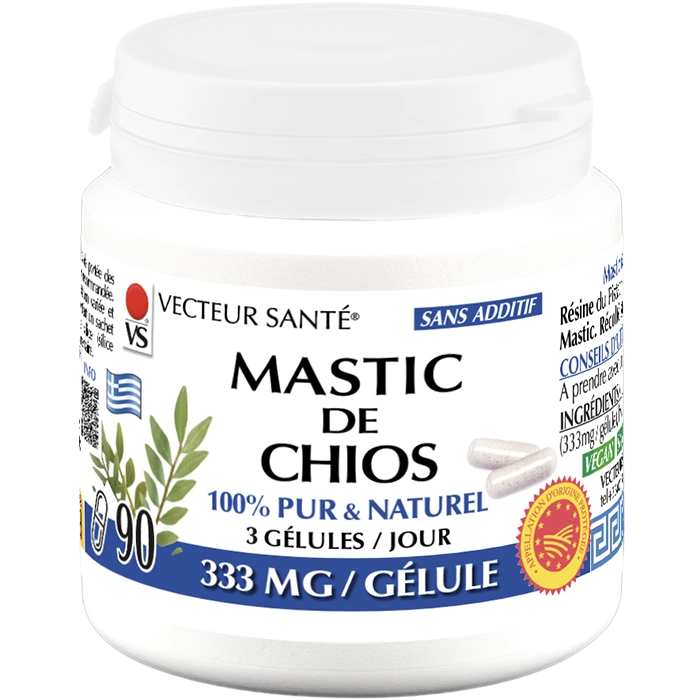 - Ingrédients : Mastic de Chios AOP 999 mg pour 3 gélules (333 mg/gélule), gélule végétale (hydroxypropylméthylcellulose). Résine 100 % pure – récoltée à la main à Chios, Grèce. Fabrication sans additif.