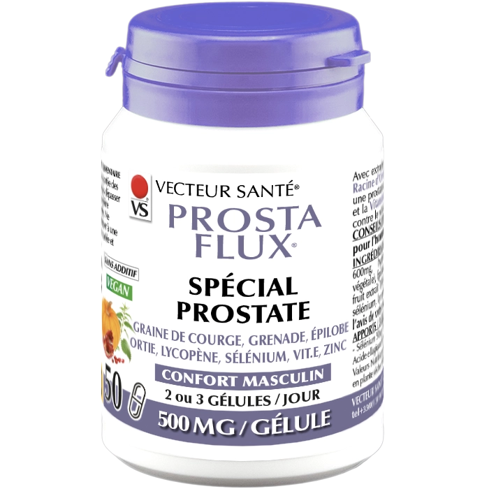 PROSTA’FLUX® SPÉCIAL PROSTATE de Vecteur Santé® est un complément alimentaire qui contient des extraits de graine de courge, d’épilobe, de racine d’ortie et de grenade, ainsi que du lycopène, du zinc, du sélénium et de la vitamine E.
