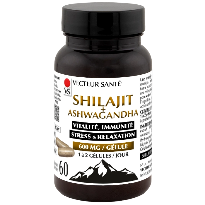 Le Shilajit + Ashwagandha de Vecteur Santé® est un complément alimentaire alliant deux des plantes phares de la médecine ayurvédique. Le shilajit (aussi appelé mumijo / mumio) est une substance organo-minérale issue des roches de l'Himalaya, très riche en acides fulviques et en minéraux. L'Ashwagandha (Withania somnifera), plante adaptogène, complète cette action en favorisant la résistance au stress et l'équilibre nerveux. Chaque gélule apporte 300 mg de shilajit et 300 mg d'ashwagandha racine bio titrée à 2,5% en withanolides.