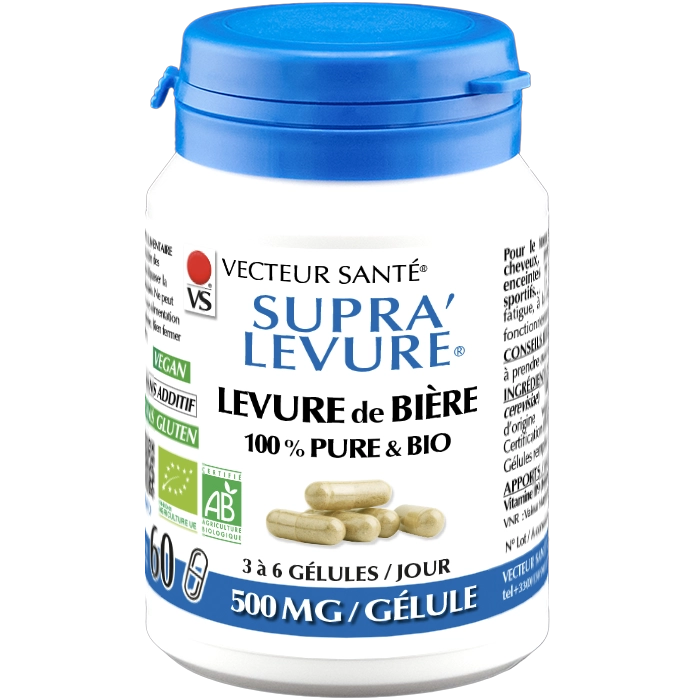 SUPRA’LEVURE® Levure de Bière Bio Gélules de Vecteur Santé® est un complément alimentaire à base de levure de bière bio (Saccharomyces cerevisiae). Grâce à sa teneur en vitamine B9 (folates), il contribue au fonctionnement normal du système immunitaire, à la réduction de la fatigue et au maintien de fonctions psychologiques normales. Fabriqué en France.