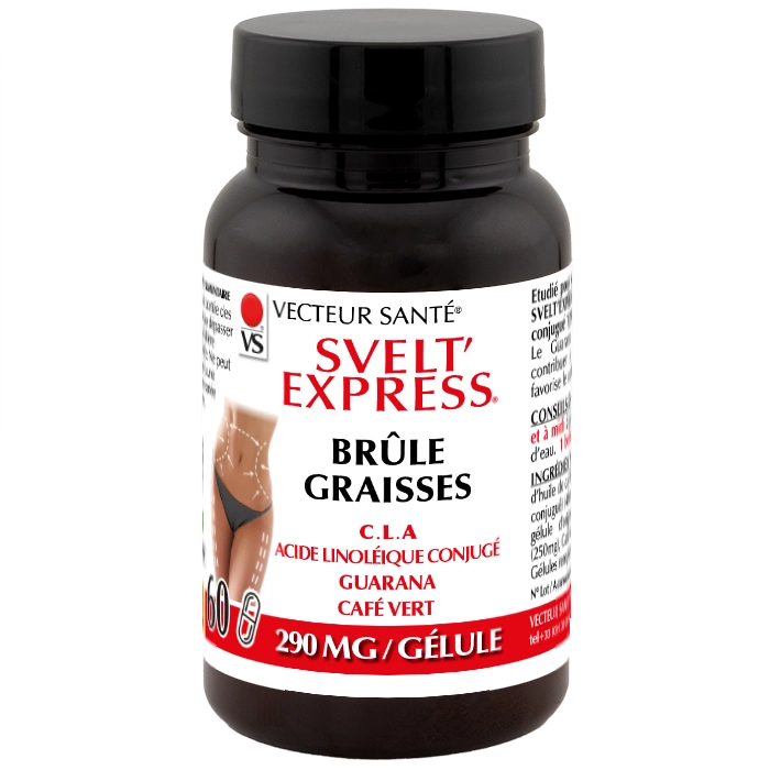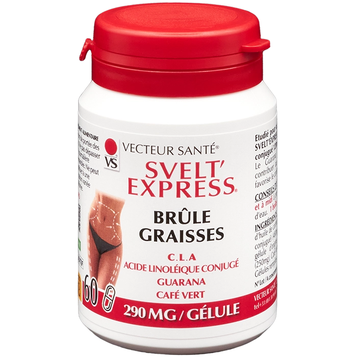 Svelt’Express® Brûle Graisses de Vecteur Santé® est un complément alimentaire associant C.L.A (acide linoléique conjugué), guarana et café vert. À intégrer dans une alimentation équilibrée et un mode de vie actif. Fabriqué en France.